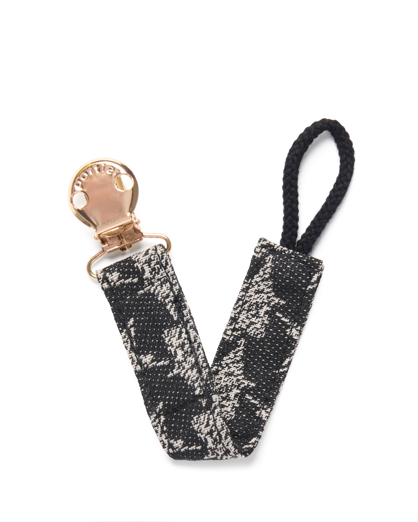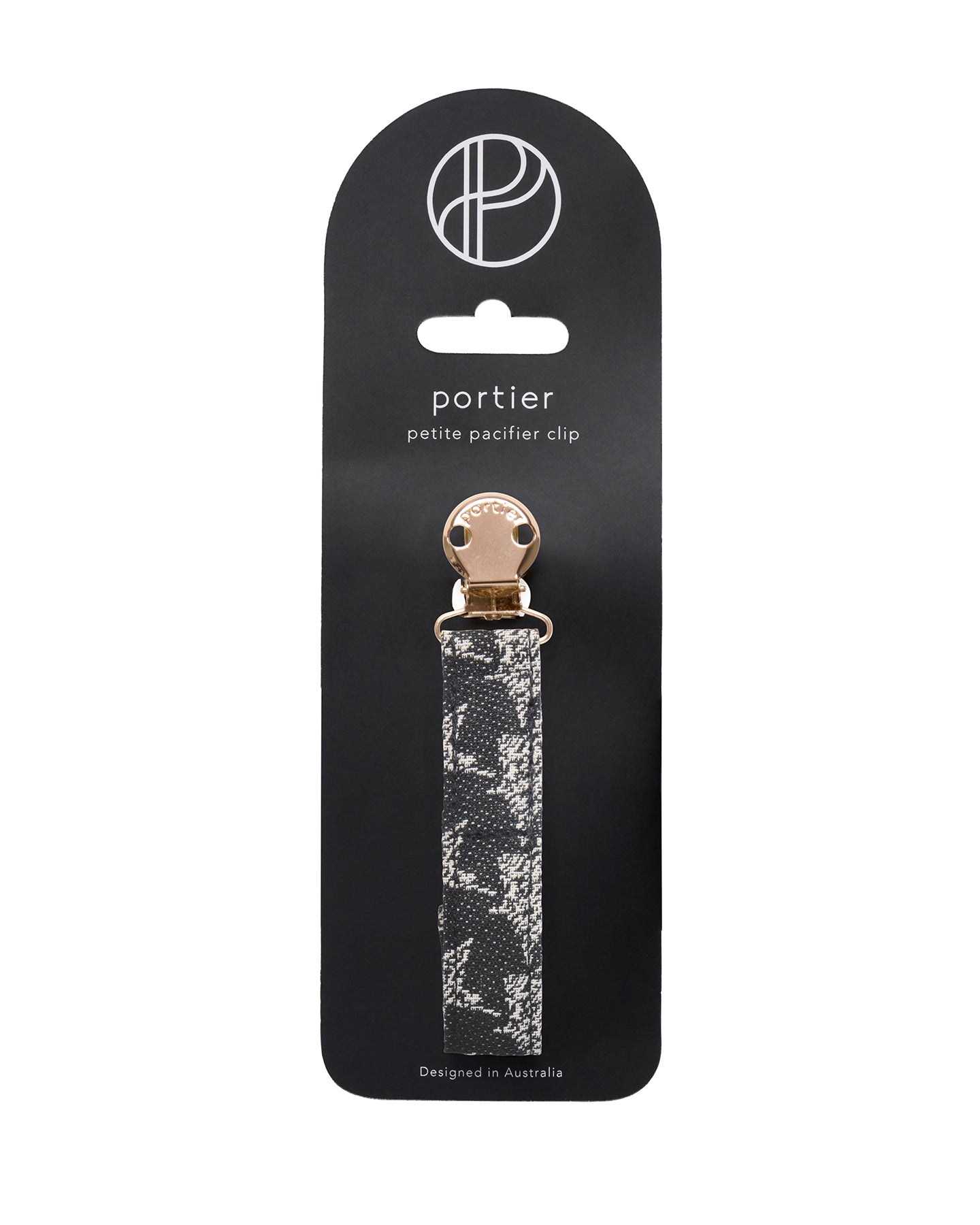 An essential designed to keep pacifiers close, clean, and always within reach. Crafted from durable cotton and finished with a gold-tone clip engraved with the Portier logo, it balances everyday practicality with refined design. The sturdy cotton loop attaches securely to your baby’s pacifier, while the metal clip fastens easily to clothing or The Limitless Baby Carrier, helping keep pacifiers off the ground and within easy reach.
